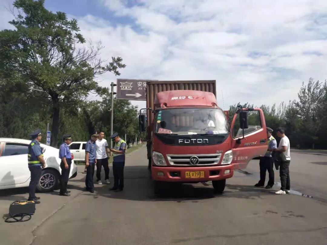 县环保部门联合交通局、交警队在上坊口对柴油车辆进行尾气监测。